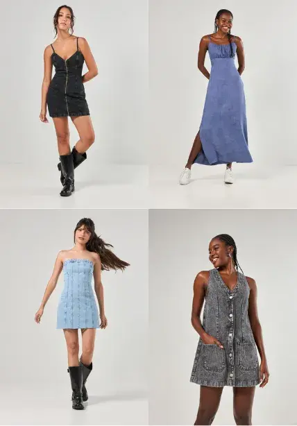 o vestido jeans tem essa vantagem de se adaptar fácil a qualquer horário. à noite, ele ganha mais força porque o tecido cria contraste com acessórios, iluminação e makes mais elaboradas.